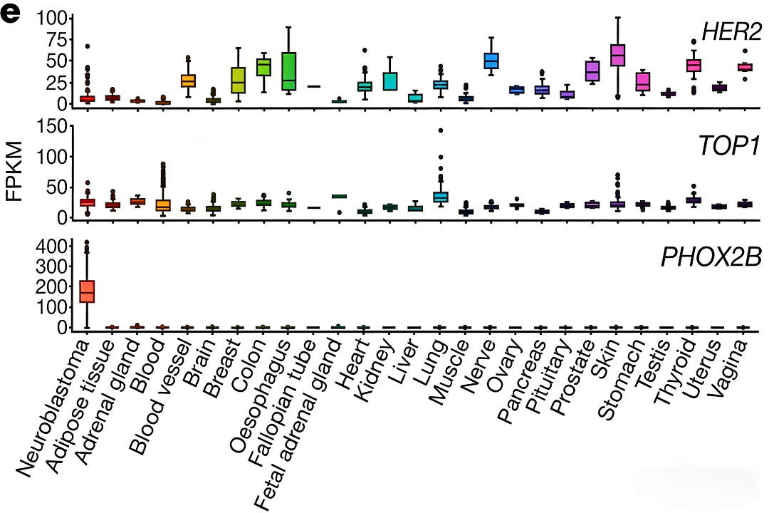 PHOX2B作为神经母细胞瘤的特异性标志物,具有多重生物学优势。该转录因子在正常组织中几乎不表达,而在神经母细胞瘤中呈现高特异性表达。这种表达模式显著区别于HER2等在许多正常组织和肿瘤中均有表达的标志物,也不同于拓扑异构酶Ⅰ等治疗靶点。