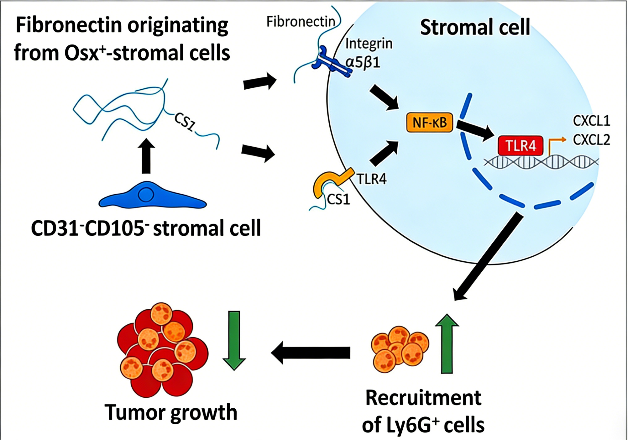 机制研究进一步揭示了从基质细胞到中性粒细胞的信号传导链条。纤连蛋白或其活性片段CS1,并非直接作用于中性粒细胞,而是首先作用于基质细胞本身。CS1通过同时激活基质细胞表面的整合素α5β1和Toll样受体4,启动下游信号。其中,TLR4的激活至关重要,它进而活化核因子κB信号通路,诱导基质细胞大量表达并分泌趋化因子CXCL1和CXCL2。这两种趋化因子是已知的、高效的中性粒细胞趋化剂。因此,被CS1"激活"的基质细胞通过分泌CXCL1/CXCL2,在肿瘤局部建立一个化学梯度,从而主动募集Ly6G阳性中性粒细胞向肿瘤部位聚集。体外实验证实,经CS1预处理的基质细胞条件培养基,能够显著促进中性粒细胞的迁移。使用TLR4特异性抑制剂处理,可以阻断CS1诱导的NF-κB活化、趋化因子表达上调、中性粒细胞募集以及最终的肿瘤抑制效应,从而完整地验证了这一信号轴。