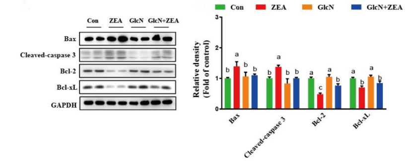 实验结果总结:ZEA处理组较对照组显著升高了胎盘组织中Bax和Cleaved-caspase-3的蛋白表达水平。并且,ZEA显著降低了抗凋亡蛋白Bcl-2和Bcl-xl的表达量GlcN + ZEA组则显著逆转了由ZEA诱导的凋亡相关蛋白的变化。GlcN可以显著减轻ZEA诱导的胎盘组织中的细胞凋亡
