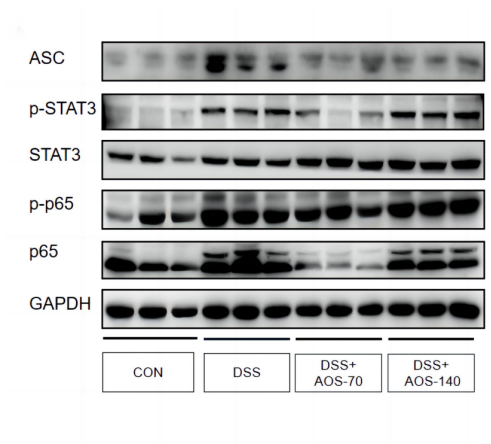 实验结果总结:AOS处理显著降低结肠组织中ASC、p-STAT3、p-p65的蛋白表达水平。70 mg/kg AOS对p-STAT3和p-p65的抑制作用更显著。表明AOS能抑制炎症信号通路(NF-κB和STAT3)及炎症小体相关蛋白ASC的表达