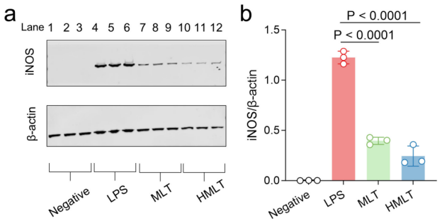 实验结果总结:该实验结果表明:LPS可显著激活巨噬细胞的炎症反应(表现为iNOS蛋白表达大幅升高);而安全浓度的蜂毒肽(MLT)及其变体(HMLT)均能有效抑制这一炎症反应,且蜂毒肽变体(HMLT)的抑制效果更突出。
