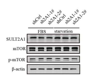 实验结果总结:敲低SULT2A1后p-mTOR蛋白表达水平显著上调,提示mTORC1通路被激活,而饥饿处理后,p-mTOR蛋白表达水平变化不显著。