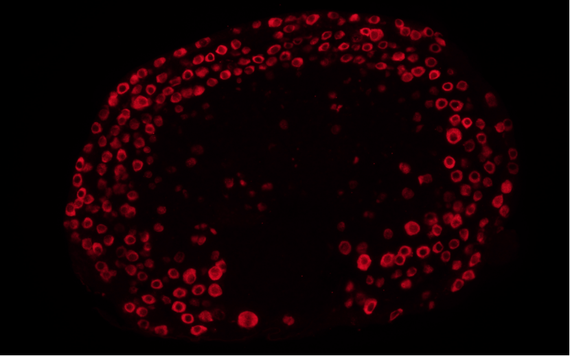实验结果总结:新生5天小鼠卵巢进行4%PFA固定8小时,然后进行脱水、透明、浸蜡和包埋处理。石蜡切片在脱蜡复水后于柠檬酸缓冲液中加热修复抗原,驴血清室温封闭1小时,DDX4 Recombinant Rabbit mAb (S-1570-48) 一抗1:300 PBS稀释4℃孵育过夜;PBS清洗3次,二抗采用ALEXA FLUOR 555 DONKEY (A31572, Thermo Fisher, 1:200) 室温孵育1小时;Olympus IX73 inverted fluorescence microscope 拍照。