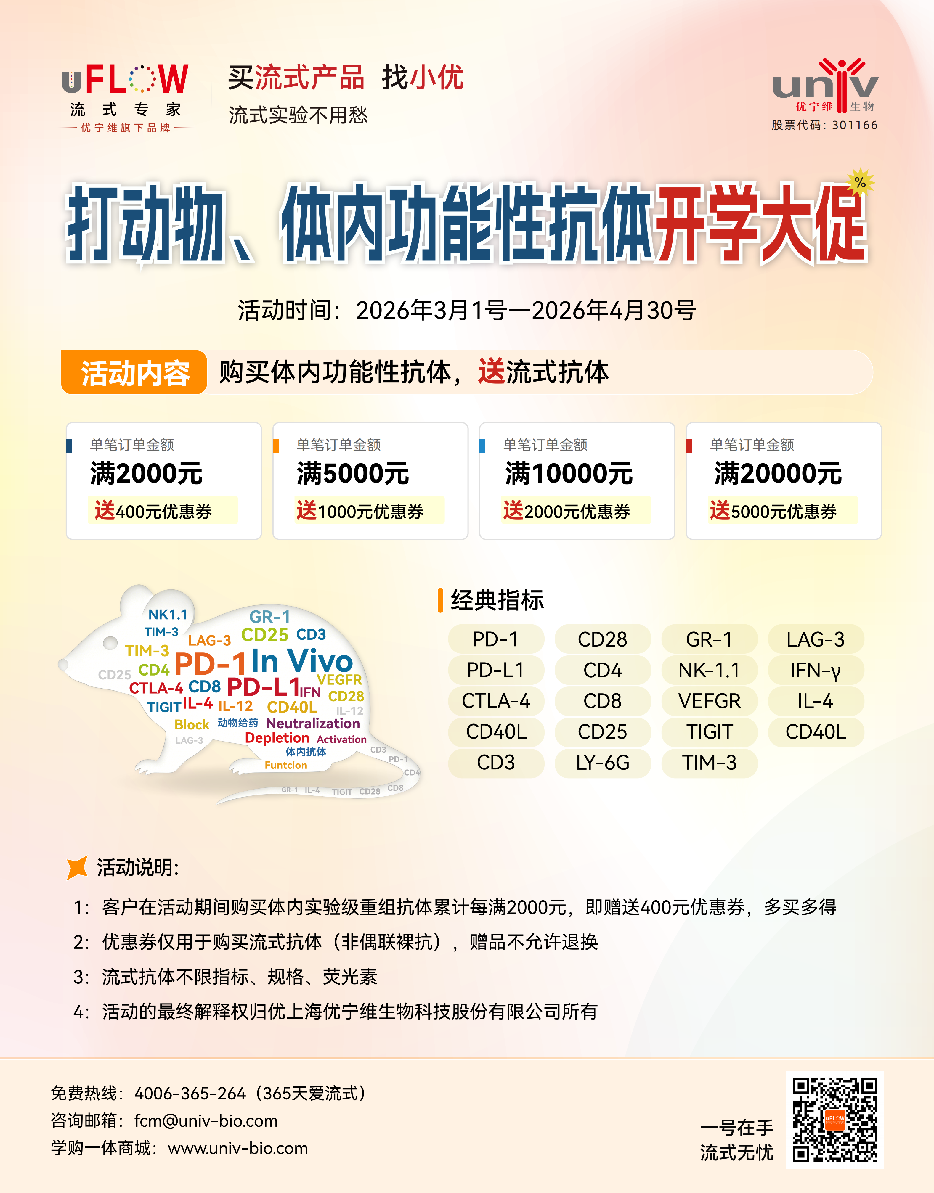 2026年3月1日至4月30日,购买体内功能性抗体,满额即送流式抗体优惠券: