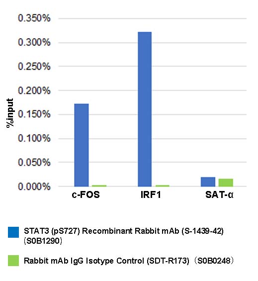 qPCR showed the enrichment of c-FOS, IRF1 and SAT-α in STAT3 (pS727) Recombinant Rabbit mAb (S-1439-42)-immunoprecipitated sample.