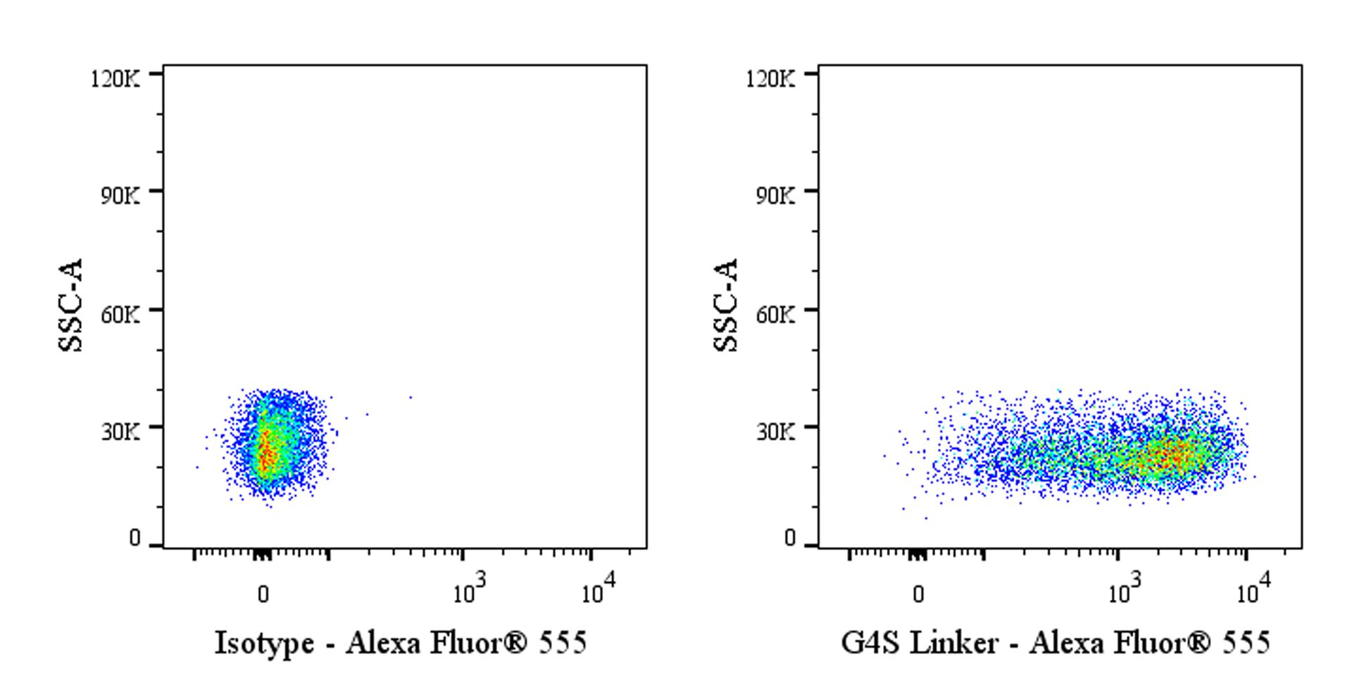 Flow cytometric analysis ScFv based CAR containing a G4S linker transfected 293T (Human embryonic kidney epithelial cell) (Right panel) or 293T (Left panel) was stained with SDT G4S Linker Recombinant Rabbit mAb (Alexa Fluor® 555 Conjugate) at 5 μl/test. Flow cytometry and data analysis were performed using BD FACSymphony™ A1 and FlowJo™ software.