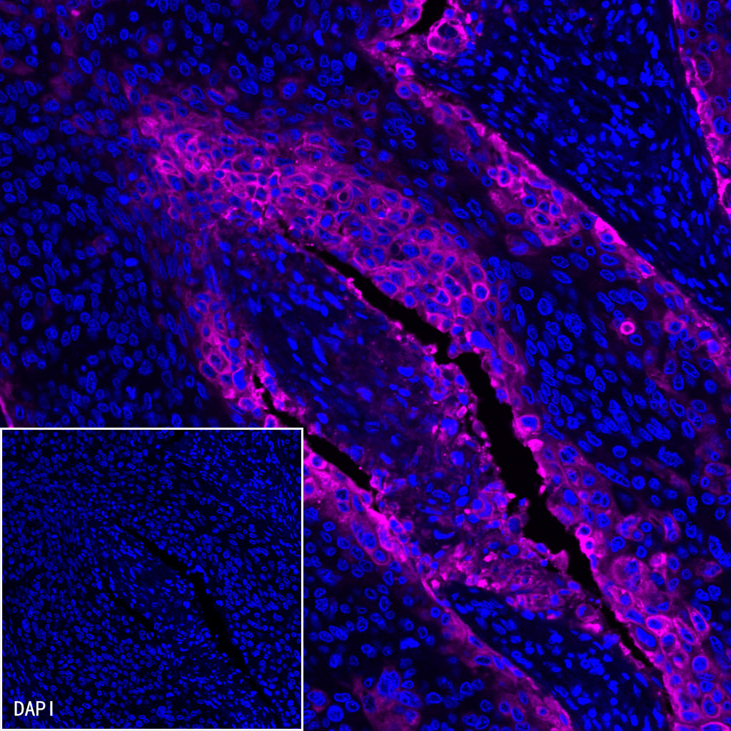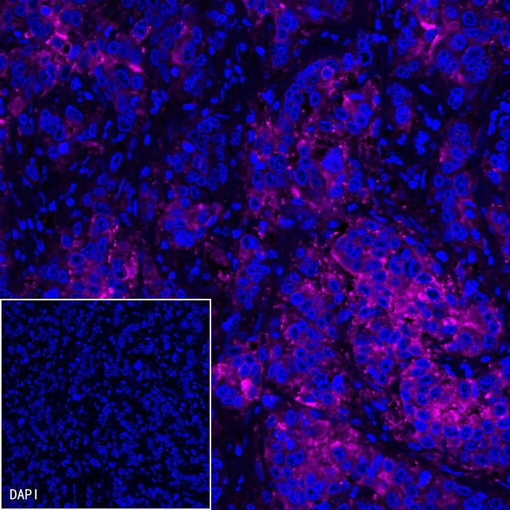 IF shows positive staining in paraffin-embedded human cervical squamous cell carcinoma. Anti-CEA(CD66e) antibody was used at 1/500 dilution (magenta) and incubated overnight at 4°C. Goat polyclonal Antibody to Rabbit IgG - H&L (Alexa Fluor® 647) was used as secondary antibody at 1/1000 dilution. Counterstained with DAPI (Blue). Heat mediated antigen retrieval with EDTA buffer pH9.0 was performed before commencing with IF staining protocol.