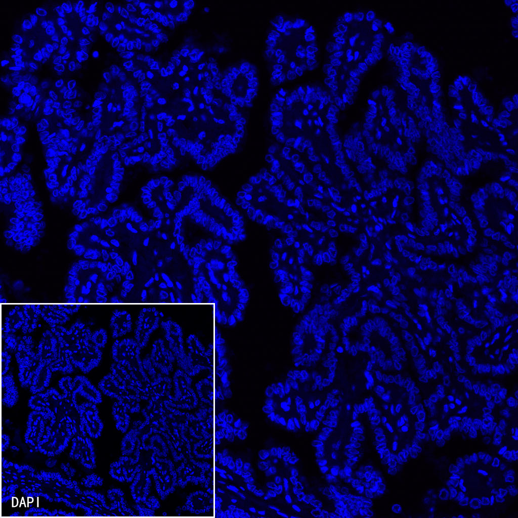 Negative control: IF shows negative staining in paraffin-embedded human papillary thyroid carcinoma. Anti-CEA(CD66e) antibody was used at 1/500 dilution and incubated overnight at 4°C. Goat polyclonal Antibody to Rabbit IgG - H&L (Alexa Fluor® 647) was used as secondary antibody at 1/1000 dilution. Counterstained with DAPI (Blue). Heat mediated antigen retrieval with EDTA buffer pH9.0 was performed before commencing with IF staining protocol.