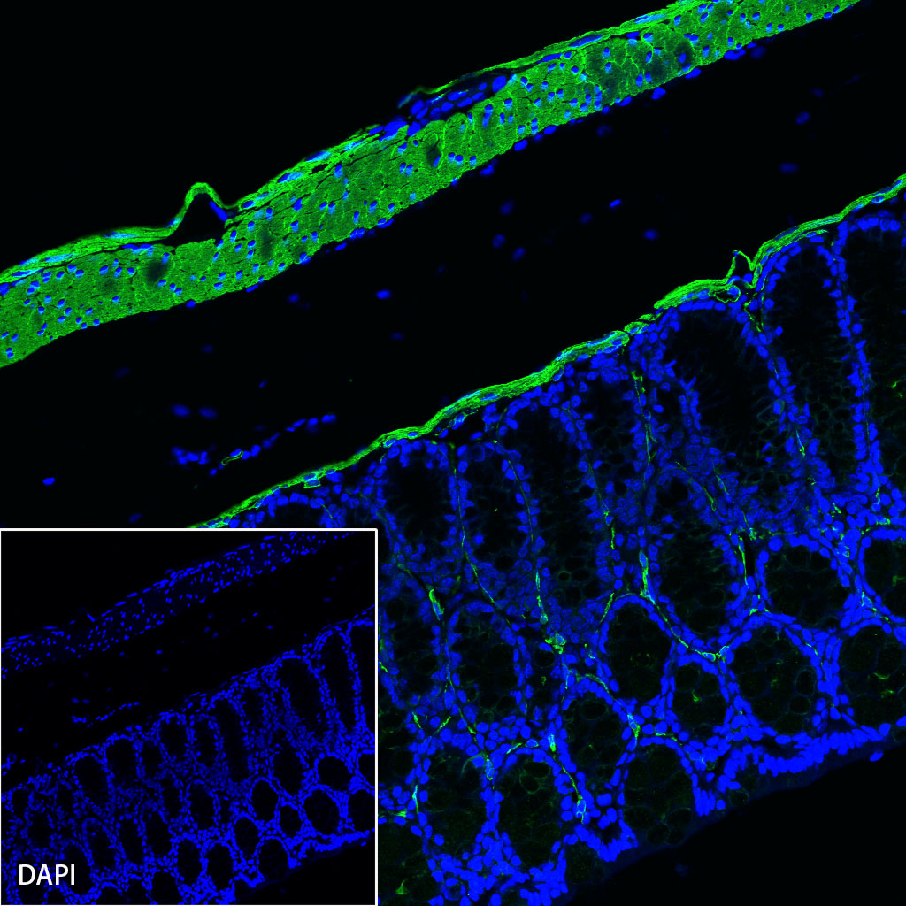 IF shows positive staining in paraffin-embedded mouse colon. Anti-alpha smooth muscle Actin (SMA) antibody was used at 1/125 dilution (Green) and incubated overnight at 4°C. Goat polyclonal Antibody to Rabbit IgG - H&L (Alexa Fluor® 488) was used as secondary antibody at 1/1000 dilution. Counterstained with DAPI (Blue). Heat mediated antigen retrieval with Tris/EDTA buffer pH9.0 was performed before commencing with IF staining protocol.