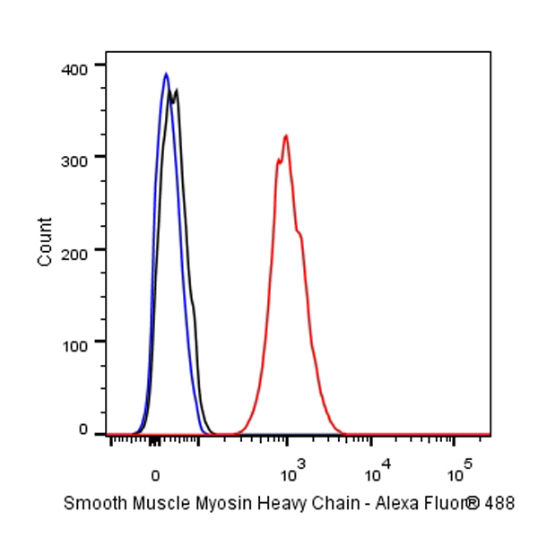 Flow cytometric analysis of 4% PFA fixed 90% methanol permeabilized C2C12 (Mouse myoblasts myoblast) labelling Smooth Muscle Myosin Heavy Chain (SMMHC) antibody at 1/50 dilution (1 μg) / (Red) compared with a Rabbit monoclonal IgG (Black) isotype control and an unlabelled control (cells without incubation with primary antibody and secondary antibody) (Blue). Goat Anti - Rabbit IgG Alexa Fluor® 488 was used as the secondary antibody.