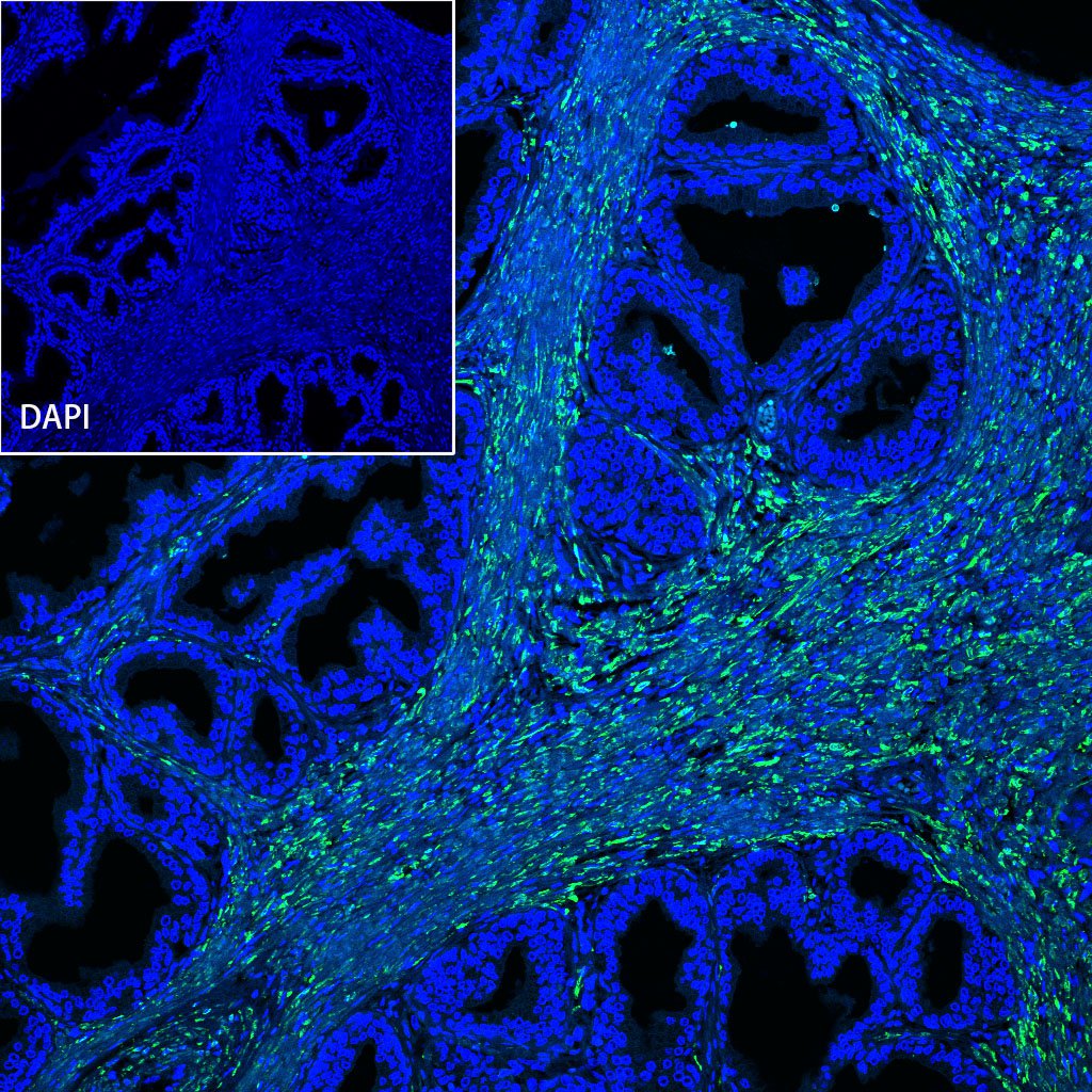 IF shows positive staining in paraffin-embedded human prostate. Anti-SMMHC antibody was used at 1/2000 dilution (Green) and incubated overnight at 4°C. Goat polyclonal Antibody to Rabbit IgG - H&L (Alexa Fluor® 488) was used as secondary antibody at 1/1000 dilution. Counterstained with DAPI (Blue). Heat mediated antigen retrieval with Tris/EDTA buffer pH9.0 was performed before commencing with IF staining protocol.