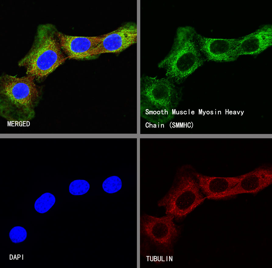 ICC shows positive staining in C2C12 cells. Anti-Smooth Muscle Myosin Heavy Chain (SMMHC) antibody was used at 1/500 dilution (Green) and incubated overnight at 4°C. Goat polyclonal Antibody to Rabbit IgG - H&L (Alexa Fluor® 488) was used as secondary antibody at 1/1000 dilution. The cells were fixed with 100% ice-cold methanol and permeabilized with 0.1% PBS-Triton X-100. Nuclei were counterstained with DAPI (Blue).Counterstain with tubulin (Red).