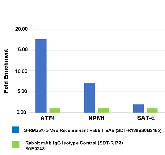 Chromatin immunoprecipitation (ChIP) was performed on HeLa cells cross - linked with 1% formaldehyde for 10 min, then chromatin was fragmented by sonication. Parallel reactions used S-RMab® c-Myc Recombinant Rabbit mAb (SDT-R138) and IgG Isotype Control (SDT-R173) at 1:50 for immunoprecipitation.