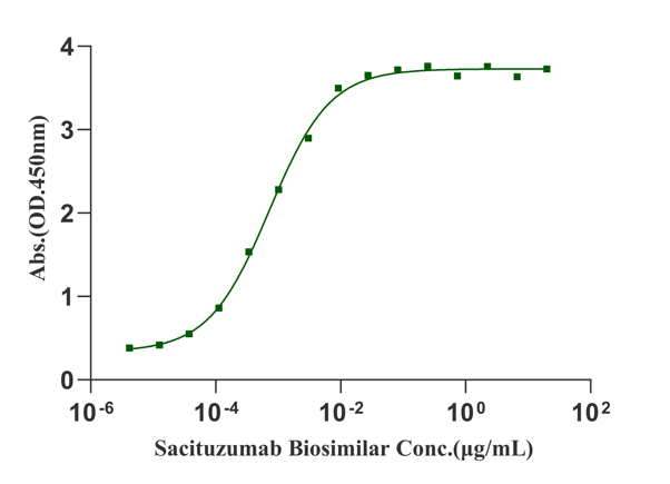 Immobilized TROP2 His Tag Protein, Human (Cat. No. UA010224) at 2.0μg/mL (100μL/well) can bind Sacituzumab Biosimilar with EC50 of 0.61-0.84ng/mL.